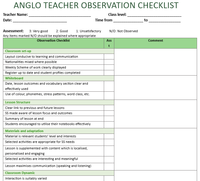 An ANGLO Teacher Observation Checklist must be completed by the TM for each full observation, then handed in to the teachers to keep. ANGLO will keep a copy.