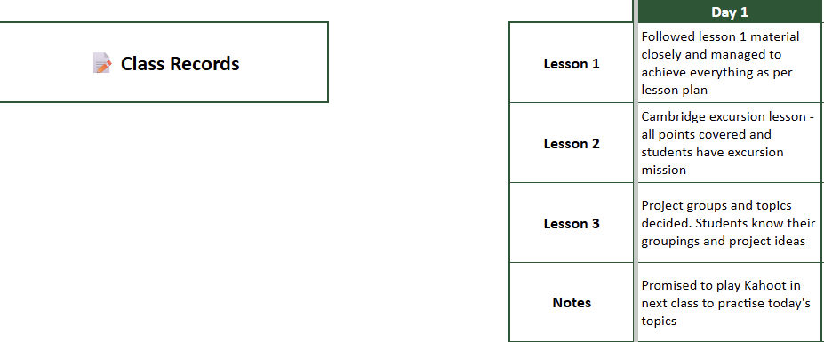 At the end of the 3rd lesson each day, fill in the Class Records (rows 29-32) with information about what you have covered in class.