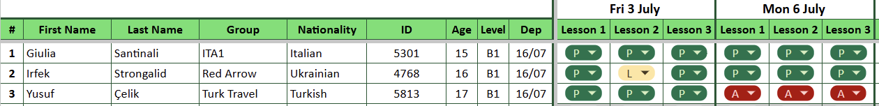 Fill in the attendance for each learning session with a 'P' for present, a 'L' for late or an 'A' for absent. Inform your TM 10 minutes into class if you have any absent students.