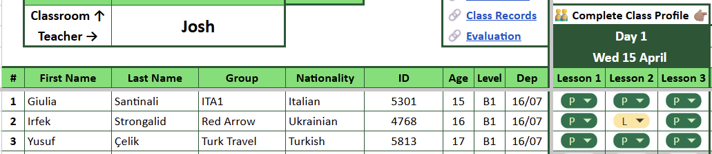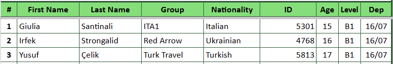 For each student in your class you have their full name, group/group leader name, nationality, ID, age, level and departure date.
