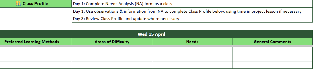 The Class Profile needs to be completed on Day 1, using the Needs Analysis and your own observations. It needs to be reviewed on Day 3 (and changed if necessary).
