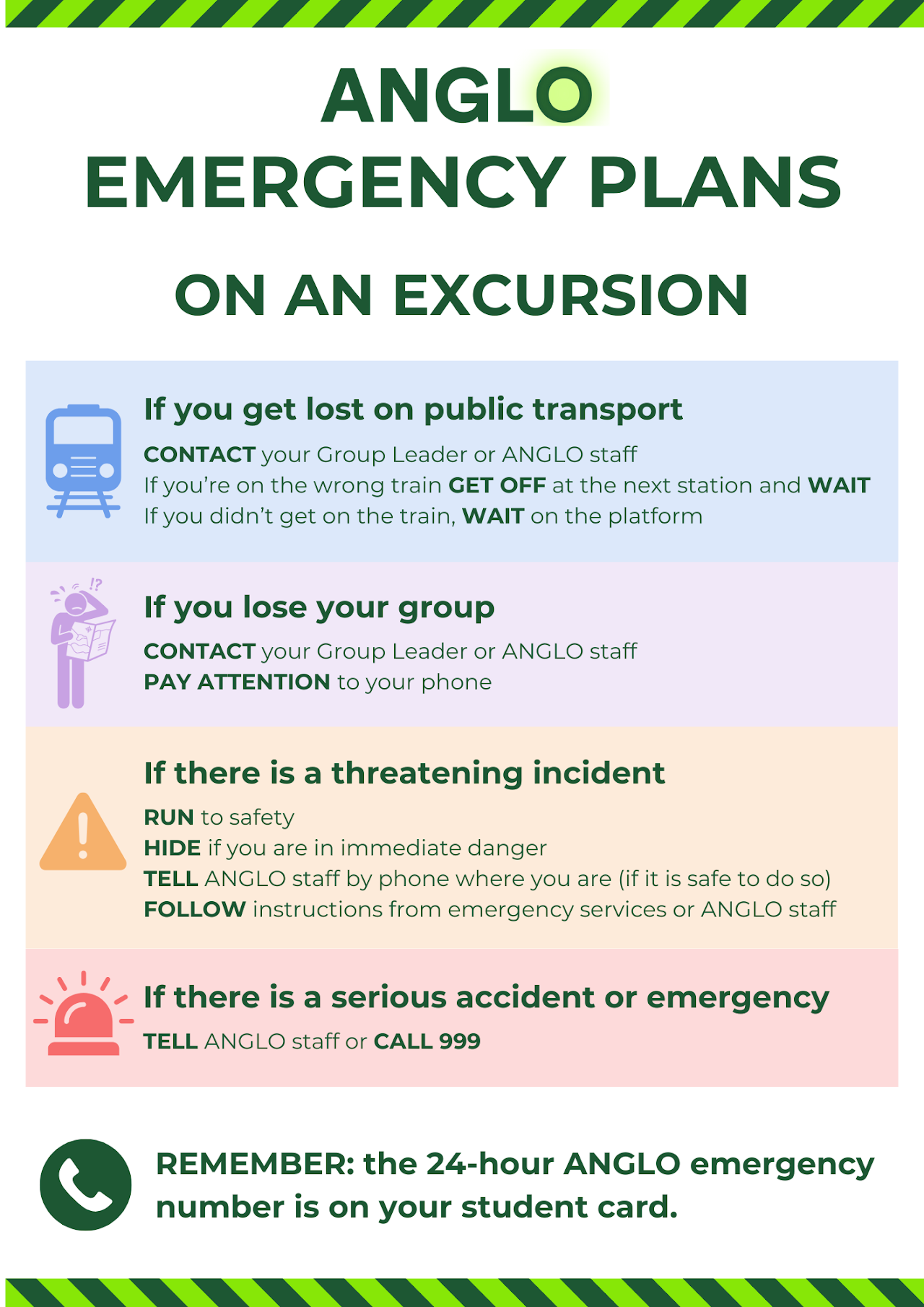 It is also essential to familiarise yourself with the simplified student version of the Emergency Reaction Plans which follow the idea of Run, Hide & Tell. These posters can be found on the Staff Hub, on Student Hubs and on the noticeboard and in accommodation buildings at centre.